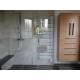 Leistung: Badsanierung im ersten Obergeschoss. Begehbare Dusche, Duschboden aus großformatigen Fliesen mit Zentraleinlauf.